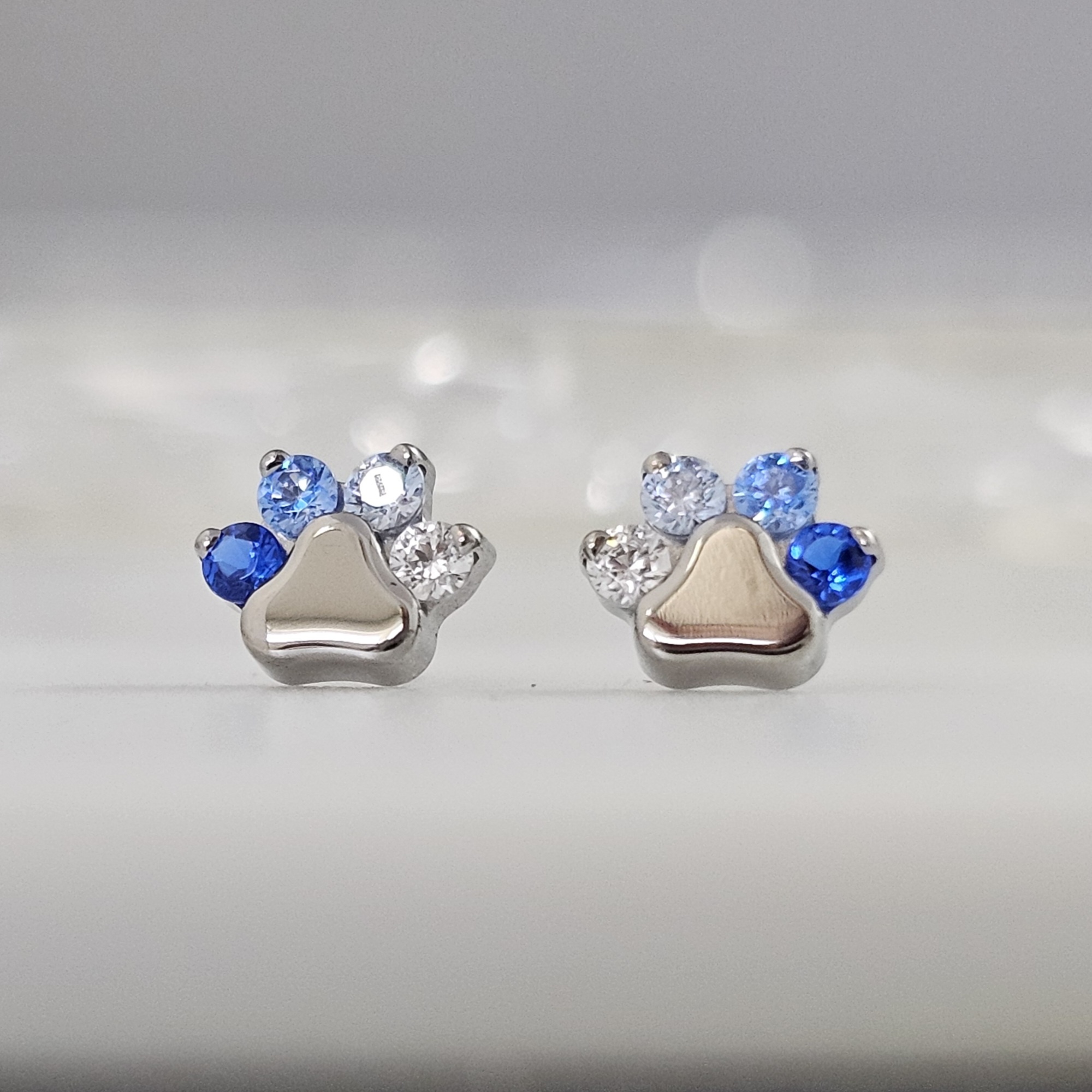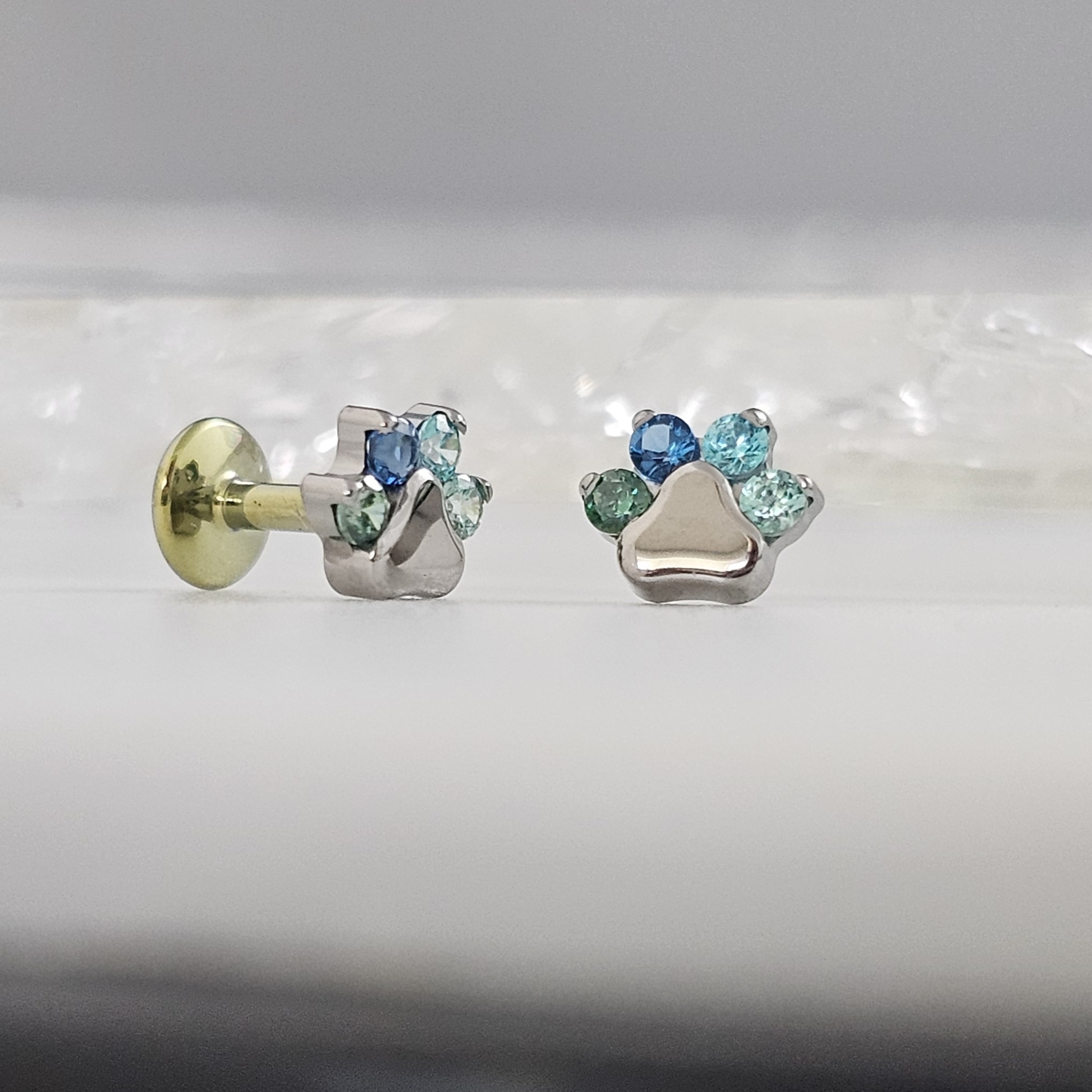 Press-Fit end in a cute pawprint shape with 4gems; set in Titanium. These are available with Swarovski gems and most synthetic opals. Measures approximately 4.5mm across
